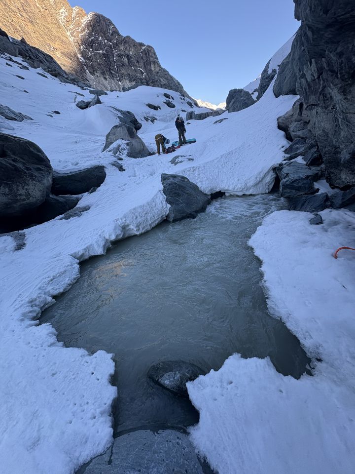 Abfahrt wie Gornerschlucht. Ja, es hat noch Schnee, aber ob die sehr schmalen Schneebrücken noch lange halten ist fraglich. Ich empfehle nein. Für Splitboarder ist diese Abfahrt mehr als nur Anstrengend.