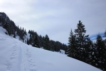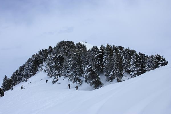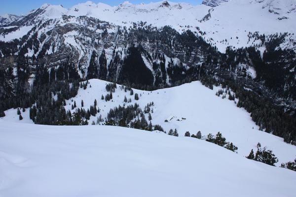Feuchter Pulver im Aufstieg. Feuchter und klebriger Schnee in der sonnseitigen Abfahrt.