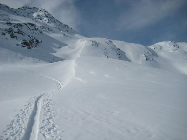 Recht gute Schneeverhältnisse aber weniger Neuschnee als erwartet ca. 20 - 25 cm in den Mulden. Die Rücken sind abgeblasen. Beim Abfahren merkt man ab und zu noch die unreglemässige Altschneedecke.