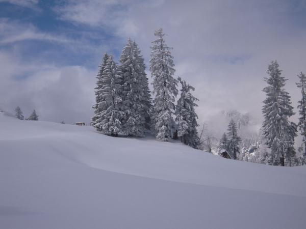 Schnee wurde bei aufkommender Wärme schon schwerer und klumpig.