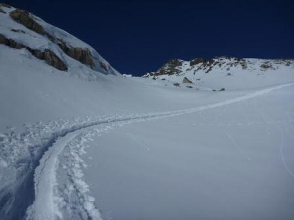 Im Aufstieg problemlos, in der Anbfahrt schöner Pulver auf gut tragender Unterlage, die kritischen Triebschneeansammlungen sind grösstenteils abgegangen. In der NO - Wand liegen etwa 10 bis 30cm Pulver auf einer tragenden Altschneedecke.