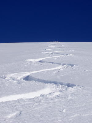 Der noch unverfahrene, sonnige und pulvrige Gipfelhang war erste Sahne :-) Es hat genug (Neu)-Schnee für die Abfahrt durch den Wald, die letzte Lichtung dann nochmals ein Pulver-Dessert :-) Schnee hats bis zuunterst genug! Einziger Spielverderber war heut der zähe Hochnebel mit Obergrenze plus minus 2000 m.....