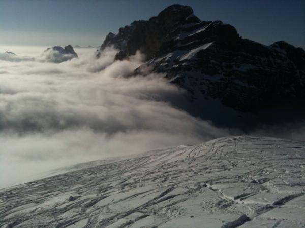 Da ich spät dran war (Start 1415) war die Abfahrt vom Gipfel Richtung Grimmifurggi bereits leicht gedeckelt, dem Grat entlang (wo nicht abgebalsen..) schöner Pulver. Unterhalb Grimmifurggi ebenfalls schöner Pulver, da die Sicht jedoch sehr schlecht war (Nebelobergrenze ca. 2100 müM) kein Genuss. Ab Alpweg Pistenähnlich jedoch gut zu fahren bis Parkplatz.