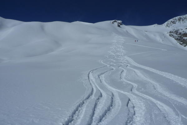 Pulverschnee; starker Wind und teilweise viele Schneeverwehungen. Steilere Partien beim Auf- und Abstieg deshalb umgangen. Wir waren mit einem Bergführer unterwegs.