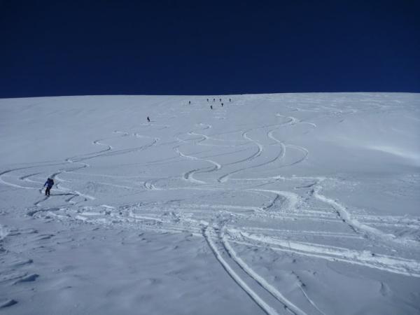 Gipfelpartie mit wenig Schnee, dafür pistenähnliche Verhältnisse und genüsslich zu fahren. Der etwas steilere Gletscherteil ab ca. 3060 bis 2900 mit gutem Pulverschnee DER Hochgenuss der Abfahrt. Ab da, leichter Bruchharst unterbrochen durch schweren Pulver und Sulz.