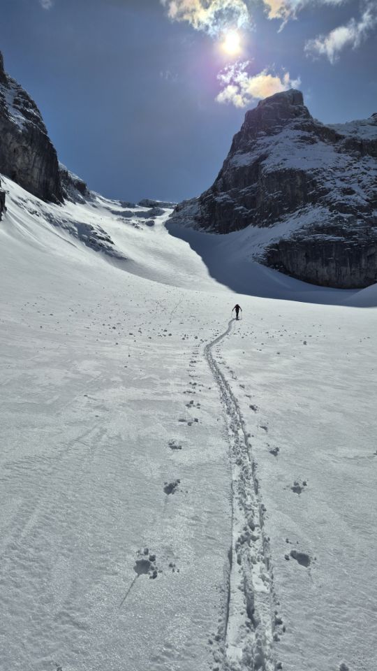 Die Tour war total einsam. Wir mussten alles spuren und sind niemandem begegnet. Nach der Abfahrt sind wir zur Lindauer Hütte gequert. Auch den Winterraum hatten wir für uns allein.