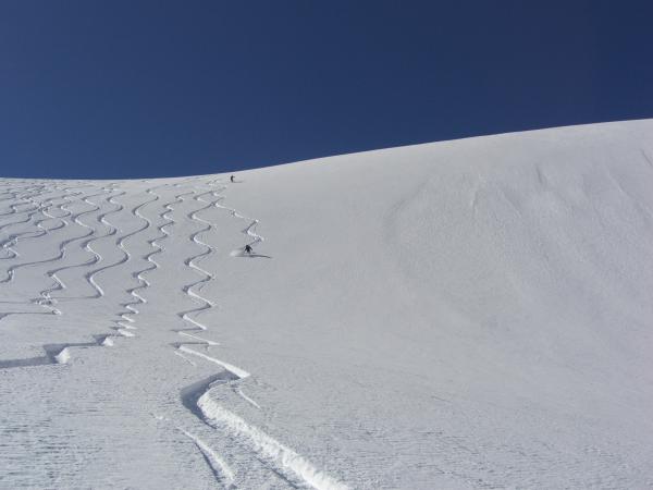 Der Hang von der Britanniahütte war gefroren. Von dort in einer guten Spur ohne Probleme weiter zum Gipfel. Abfahrt Richtung Mattmark zwischen Punkt 3451 und innerer Ture. Auf ca. 3000 Meter nach links zur Aufstiegsspur und zurück zur Hütte. Ca. 30 - 40cm Pulver vom Feinsten auf der Abfahrt, einfach super.