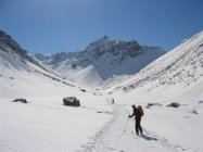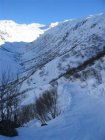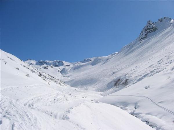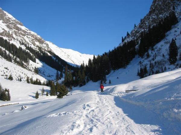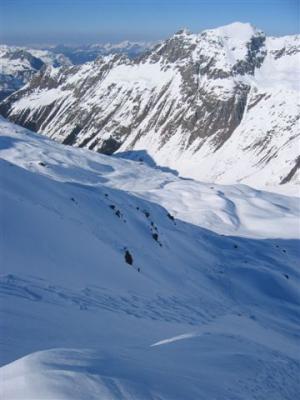 Aktuell sind die nordseitigen Abfahrten von der Bergkette zwischen Wintertal und Schlappintal lohnender. Bester Schnee, weil schattiger, und im flachen Tal kann man sich auf dem Weg zurück an die ausgefahrene Spur inmitten des Bruchharsches halten.