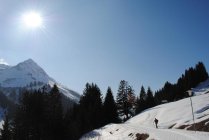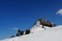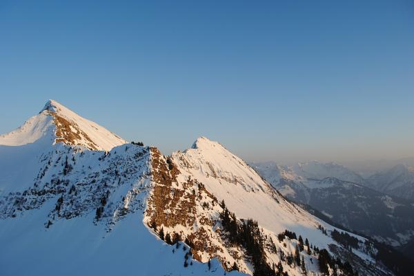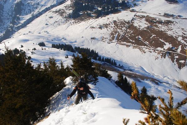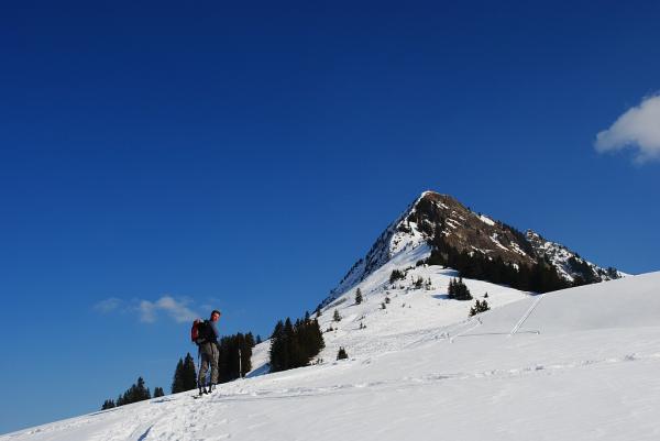 Am Gipfelgrat eine bereits vorhandene Trittspur, Abfahrt nord- und westseitig noch fein pulvrig