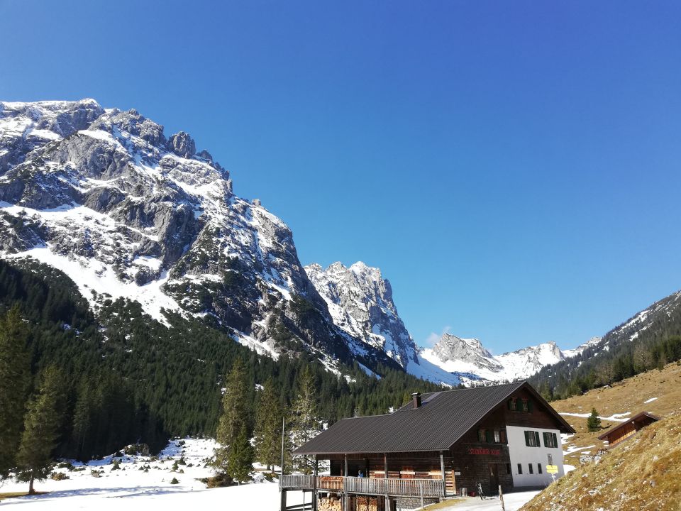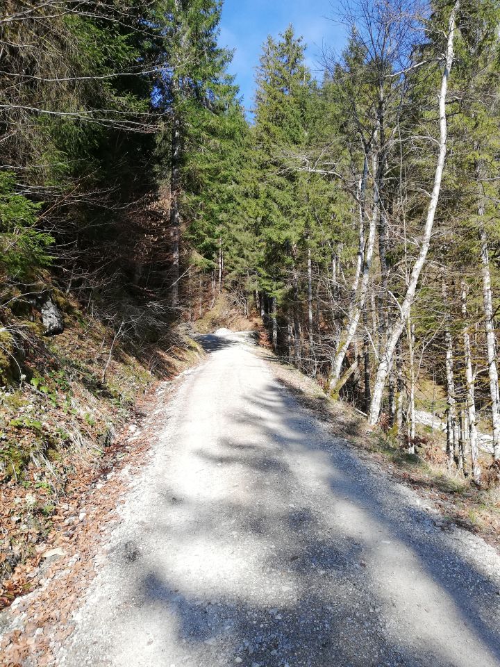Bergwald & Almgebiet: Im Talbereich frühlingshaft, erste Blüten sichtbar. Keine Weidetiere gesichtet.