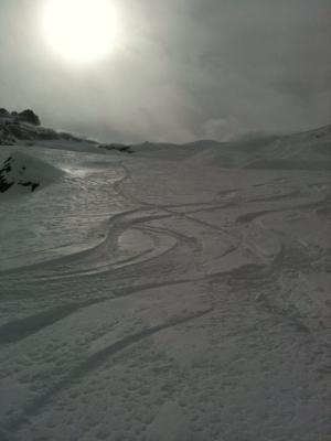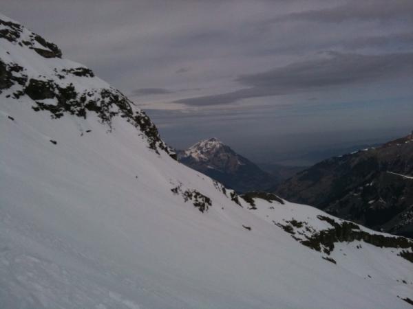 Abfahrt im oberen Teil etwas windgepresster Pulver dann recht schöner Pulver (je nach Routenwahl) bis etwas oberhalb der oberen Bundalp. Von dort an etwas Bruchharstdeckel aber fahrbar. Unterhalb der oberen Bundalp wieder gepresster Pulver bis zum Alpweg. Auf diesem pistenähnlich bis auf die Griesalp. Strasse In den Tschingel hinab hart und zum Teil eisig, aber noch knapp ohne Tragpassagen fahrbar.