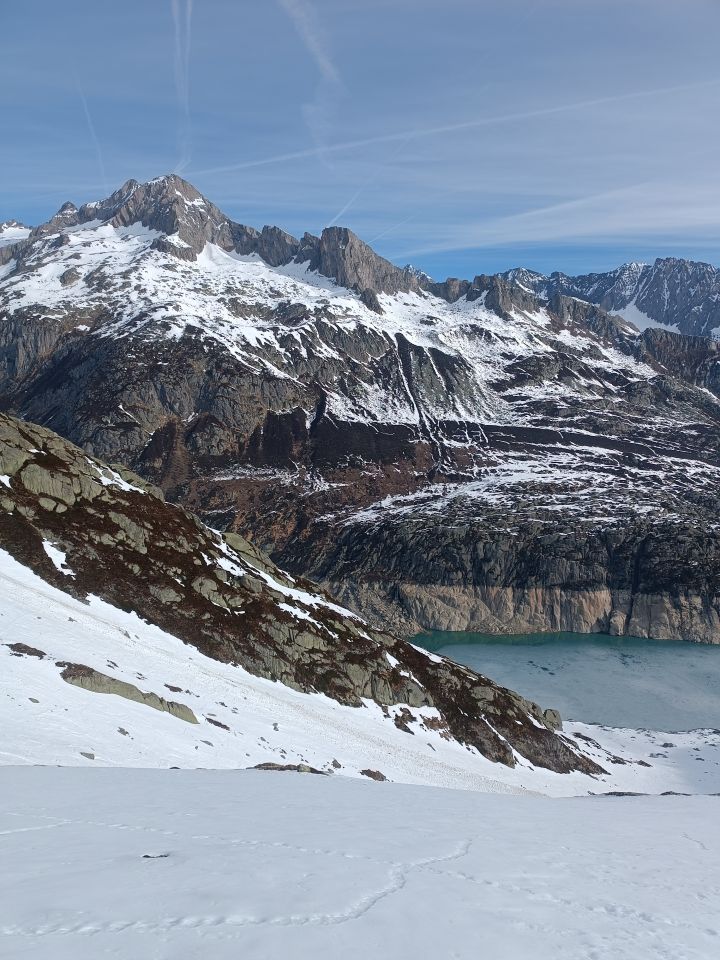 Die Querung nach dem Staudamm auf Abfahrtsspuren mit Harscheisen oder Steigeisen gut machbar (mit Steigeisen eher "entspannter").Der weitere Aufstieg auf hartem meist griffigem Schnee.Abfahrt war oben hart,zt.sulzig.Die unteren Hänge um die Mittagszeit leicht sulzig.Die Strasse von Göschenen auf den Damm ist geräumt,aber offiziell noch gesperrt (Barriere hinter Abfrutt).Taxidienst mit Christian und Lydia Näf,Geissenparadies Göscheneralp.