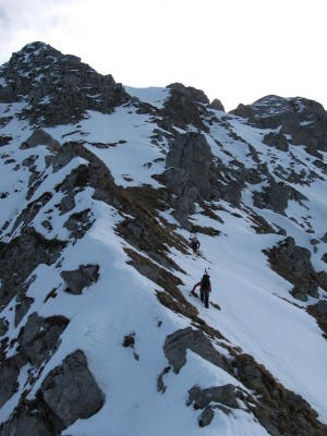 NW-Grat am Paray ausgesetzt aber in gefrohrenem Gras und Fels gut durchsteigbar. Abfahrt Paray-Couloir unberührt und in tollem Pulver! Hälfte Ecri SW-Couloir mit Skiern - ab Lawinenkegel mit Steigeisen weiter bis auf Gipfel. Abfahrt Ecri N-couloir zuerst etwas verfahren (eng...), dann in gutem Pulver bis unterhalb Bounavaux! Sommerweg Bounavaux z.T. schon knapp, jedoch anschlissend über Fahrstrasse bis 200m an Auto heran mit Skiern an den Füssen... ;-)