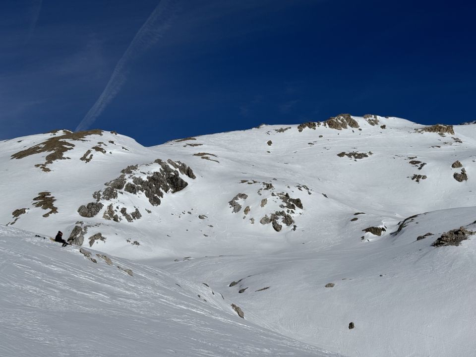 Von der Passstrasse zum Valetta Güglia gerade noch ausreichend Schnee. Bei der Abfahrt sind Steine zu beachten. Ab dem Valetta dann gute Schneedecke. Nach den trockenen Tagen und kalten Nächten überwiegend verfrorenen Büsserschnee, in Mulden vereinzelt Bruchharsch. Im Gipfelbereich kein Schnee, das Ski Depot deshalb entsprechend tiefer.