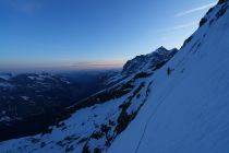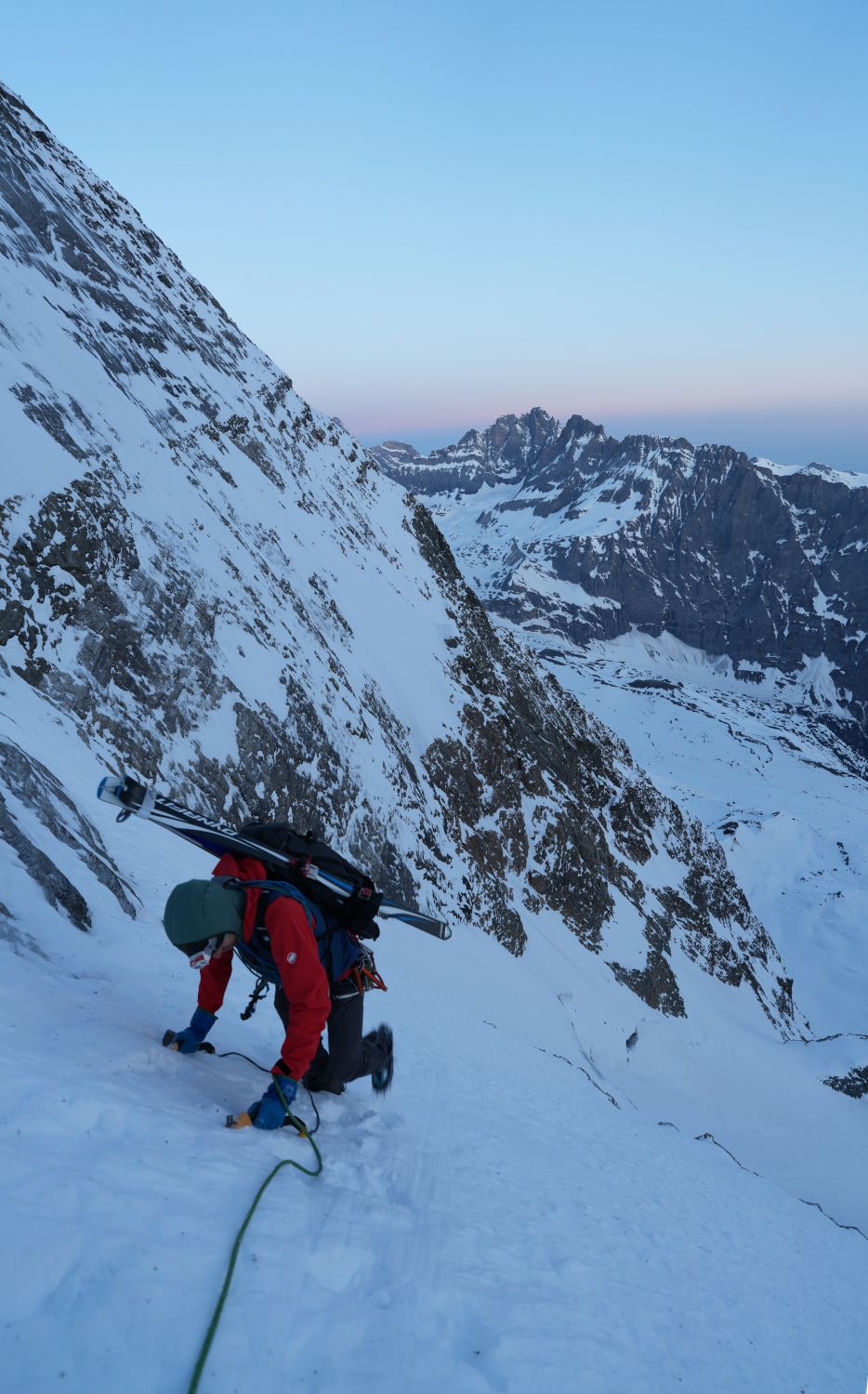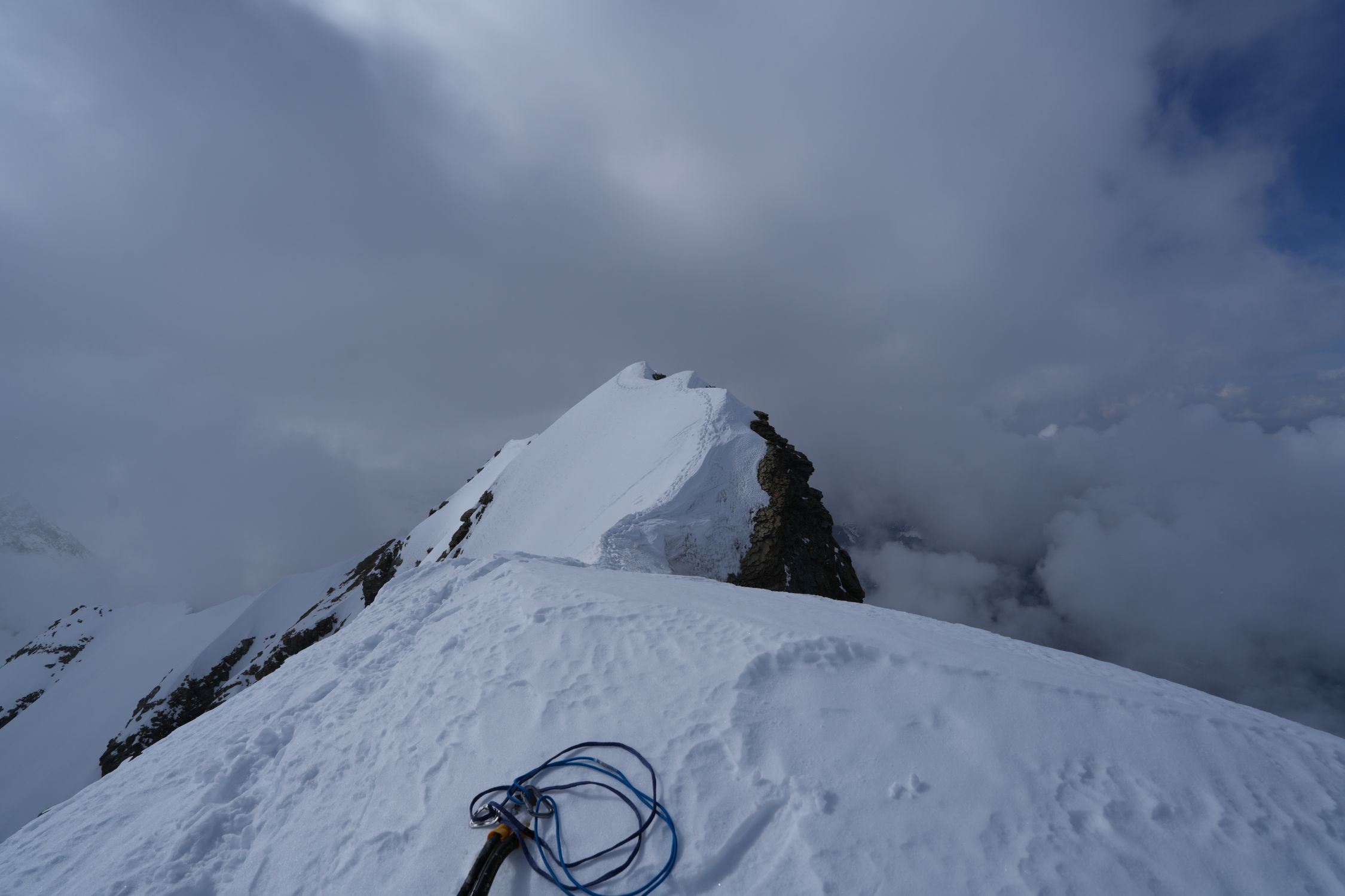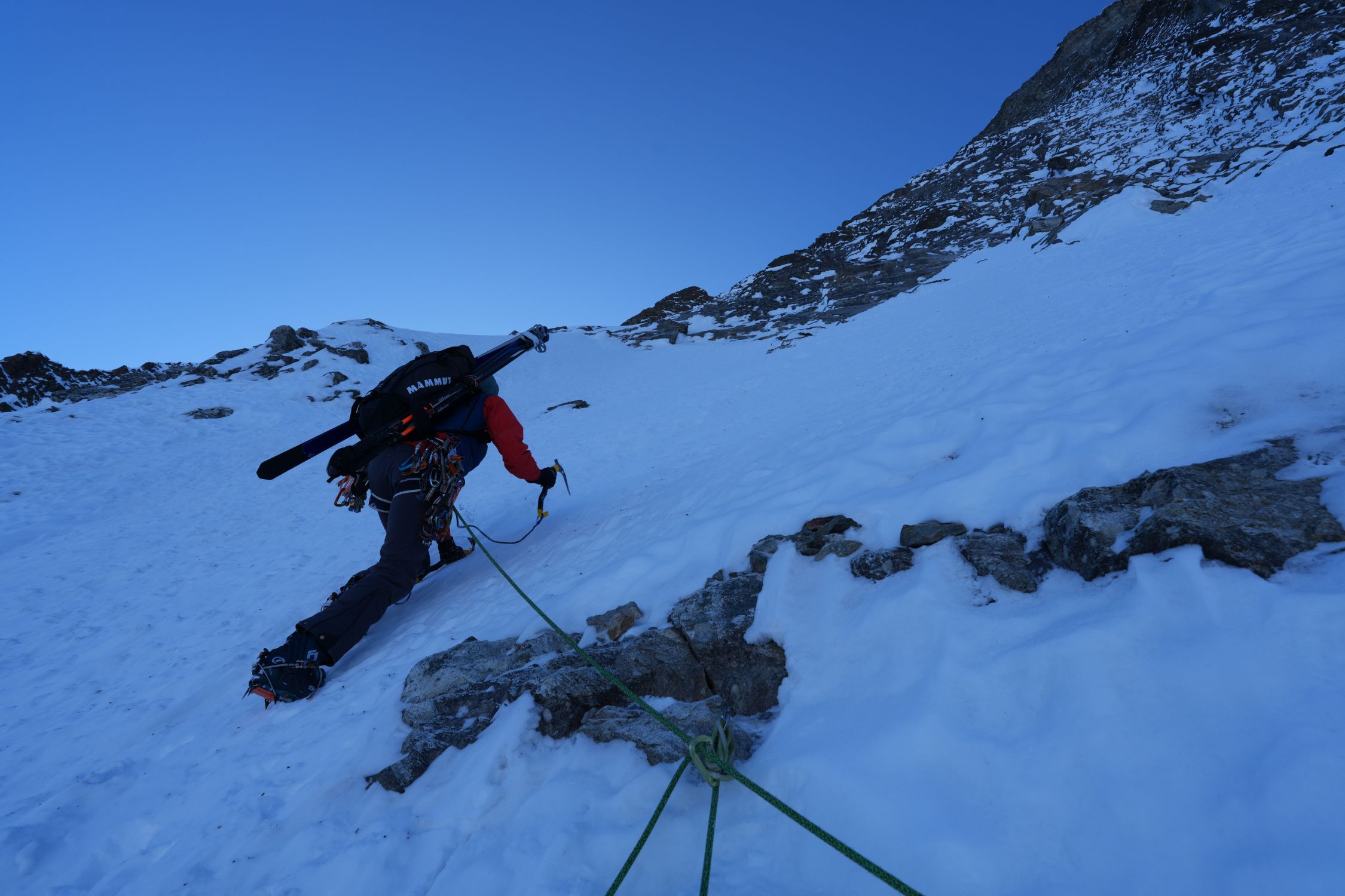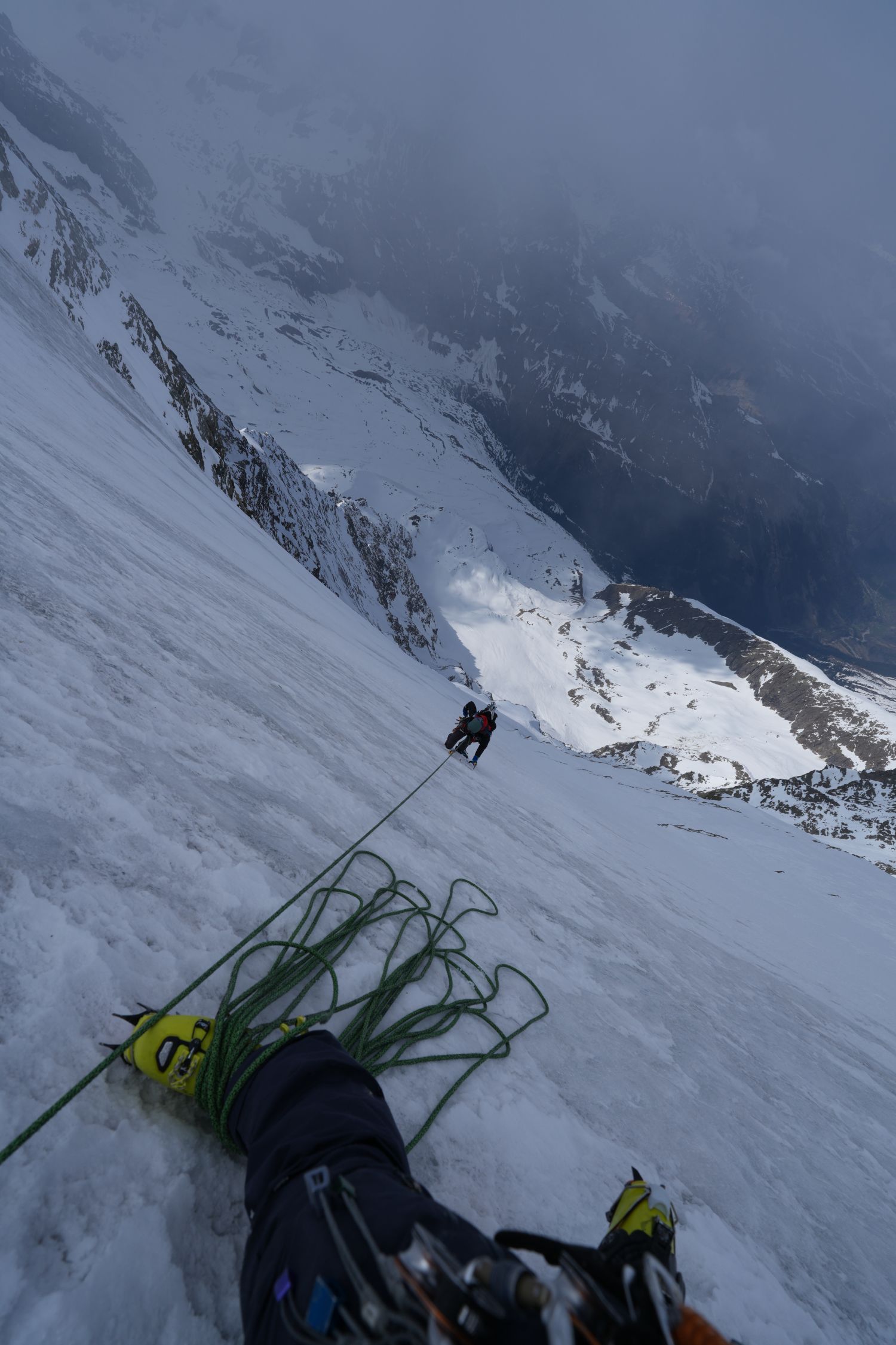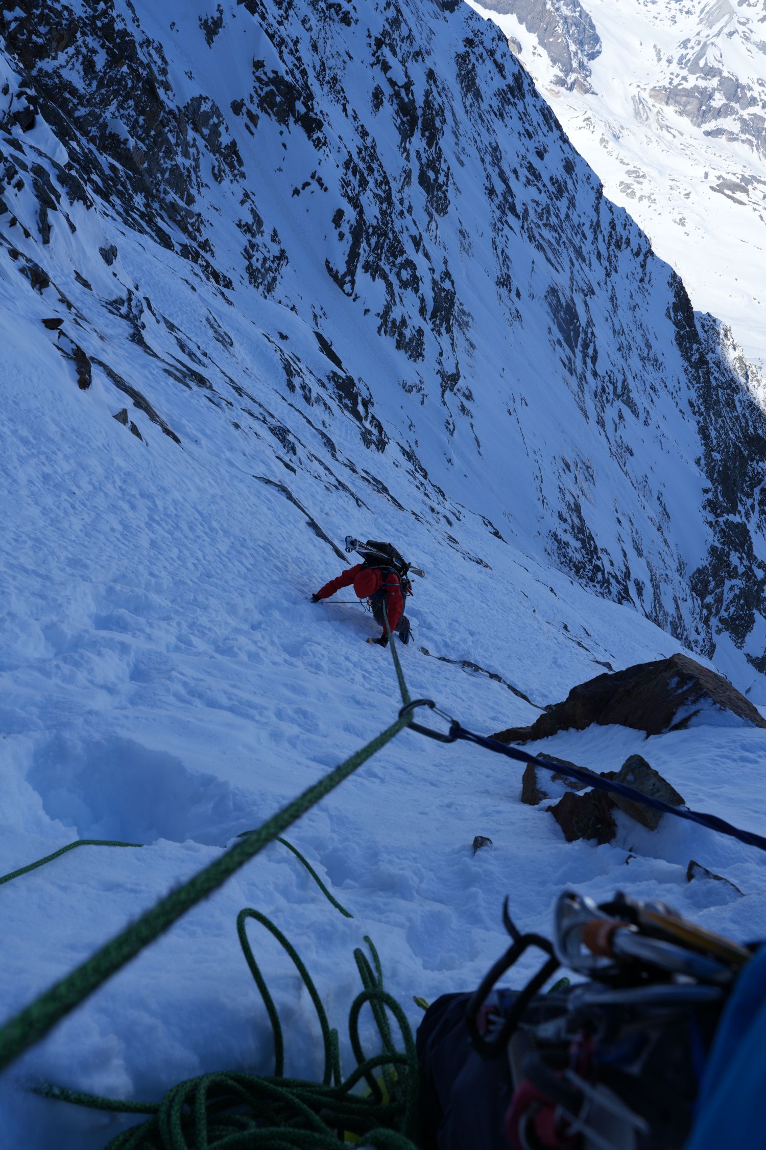 Die Route durch die Nordwand des Grosshorns ist eindrücklich und lang. Das "lang" war bei uns vor allem wegen den Verhältnissen. Von weitem sah es nach quietschi Schnee aus, also neige styropor. Vor Ort war es von Beton über Trittschnee bis Kristallzuckerschnee alles. Im Oberen Teil sprödes, hartes Eis mit Schneeglasur. Die ganze Route ist schlecht absicherbar und teilweise recht exponiert. Wir hatten die Ski dabei und sind nach dem Gipfel den Südgrat runter und dann mit den Ski bis nach Blatten und auf den Bus. Lange Tour die leider nicht mehr besser wird. Früher sicherlich eine wunderschöne Firntour.