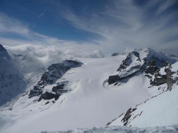 Eitel Sonnenschein und ein paar Schleierwolken zu Beginn der Tour gegen 8.30 h. Der Fönwind gebärdete sich zunächst harmlos, indem er uns nur von Zeit zu Zeit an entsprechend exponierten Stellen mit mäßig kräftigen Böen bedachte. Am stärksten waren diese auf dem Gipfel, aber auch dort blies der Wind nicht permanent. Richtung Clariden und Claridenpass griffen Wolkenwalzen über, der Blick zum hier allmächtig auftretenden Tödi blieb während unseres Gipfelaufenthaltes ungetrübt.