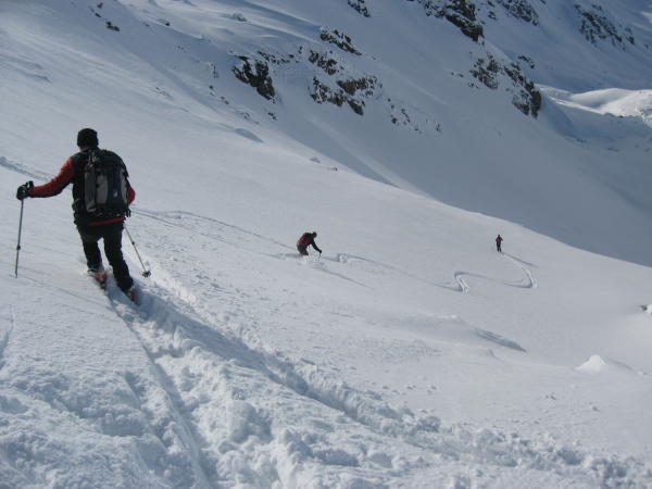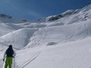 Lange einsame Tour im etwas windgeschützteren Arlberggebiet, im fast gesamten Aufstieg kein Wind, erst ganz am Gipfel oben mit mässiger Stärke. Der mächtige Bergstock der Eisentalerspitzen lockt gleich mit zwei Gipfeln, dem östlichen und dem westlichen, für letzteren haben wir entschieden. Der Zustieg vom Nenzigasttal ins wunderschöne Eisental erfolgt über einen steilen Lawinenrutsch, danach eröffnet sich ein landschaftliches Juwel. Herrliches Skigelände bis zum Skidepot an den Felsen. Die letzten Meter zum Gipfel erfolgen im teils schon aperen Südhang zu Fuß. Abfahrtsmäßig ist die Tour bis zum Eingang ins Nenzigasttal immer noch pulvrig, danach wirds etwas ruppiger und der Slalom durch große Steinblöcke auch abenteuerlich bis man die Talebene erreicht und dem Forstweg folgt.