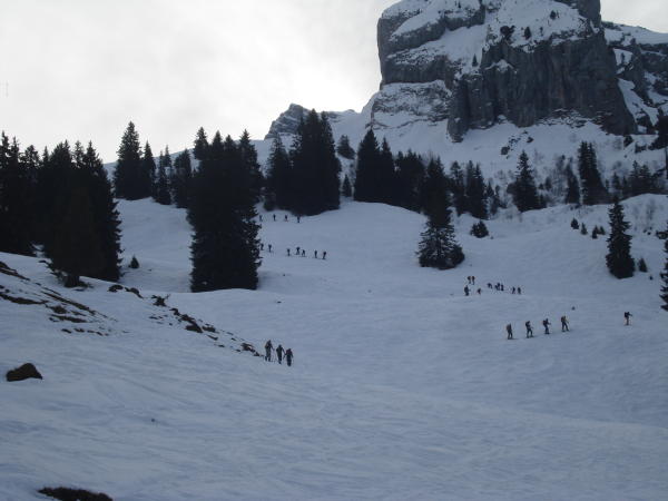 Abfahrt: So etwas wie Pulver gabs nur an steilen Schattenhängen, die man problemlos befahren konnte. Ansonsten herrschten im oberen Teil gefrorene Verhältnisse. Ab etwa 1600 m.ü.M lag ein übler Harschdeckel, der das Drehen mit dem Board kaum mehr zuliess. Ab Lufthütten herrschen pistenähnliche Verhältnisse. Abfahrt über Rinderweid ist mit dem Board vor allem beim letzten Steilstück auf die Forststrasse schwierig, da es kaum mehr Schnee hat. Besser wäre die Abfahrt über «Über Boden».