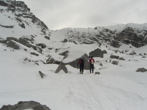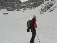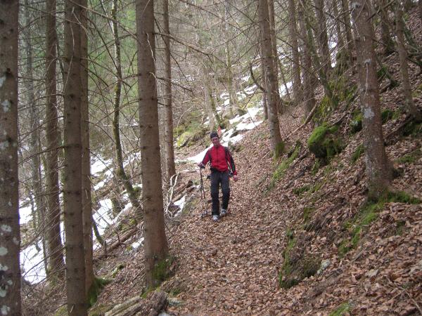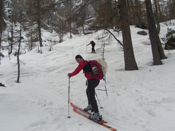 momentan muss man die Ski 400m durch den Wald tragen; unten noch im Wald ist es sehr sulzig, es war heute wg. Föhn auch sehr warm; im Kar dann heftiger Wind bis größere Sturmböen, welche einen das Gesicht mit Schneepulver bestrahlt haben; der frisch eingewehte Pulver machte es auch sehr anstrengend für den Aufstieg (Abrutschen bei jedem Schritt); An den Felsbändern und am Gipfel erstaunlicherweise kein Wind! Weg auch gut gangbar, wir hatten Steigesisen dabei; Abfahrt ging auf harten Platten mit draufgewehten Pulver sehr gut, ansonsten sehr ruppig; man konnte sich bei Querungen vom Wind anschieben lassen; im Wald schwerer Schnee;