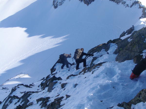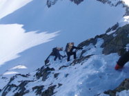 Bei der ausgetretenen und teilweise schon eisigen Spur am Gipfelgrat wären Steigeisen hilfreich gewesen, aber nicht zwingend notwendig.