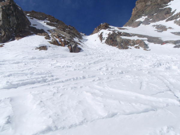 Die Wildgratscharte ist zu Fuß beidseitig gut zu begehen. Richtung Franz-Senn-Hütte kann die Rinne auch "abgerutscht" werden.