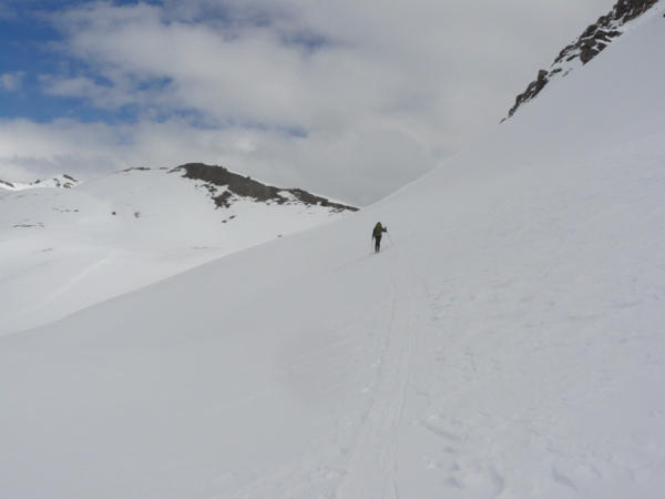 einzelne Nassschneerutsche im unteren Bereich; auch Schneebretter in den eingewehnten Hängen