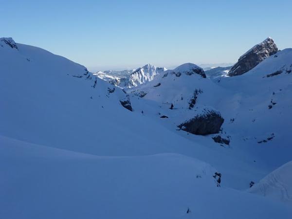 Einige abgegangene Spontanrutsche. Abfahrt bis ins Tal möglich, (50meter zum schluss tragen)