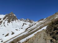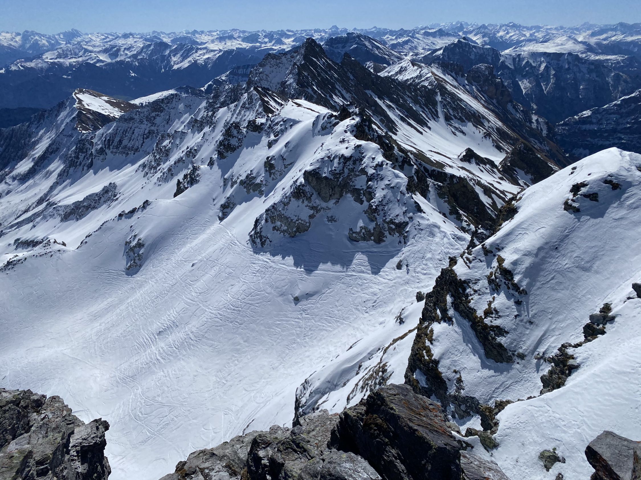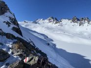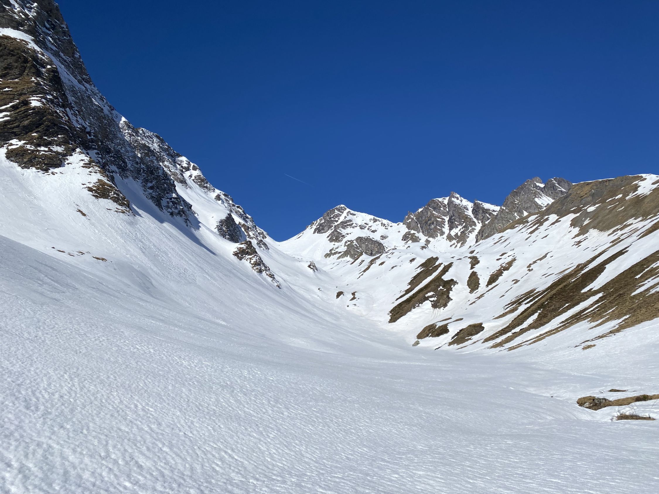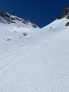 Das "ausgezeichnet" gilt vor allem für das freundliche und fast windstille Wetter und die annährend sommerlichen Bedingungen ab Skidepot zum Gipfel. Von Valens ist die Fahrstraße mit dem MTB bis zur Obersäss befahrbar (nicht von den 4-5 kurzen Schneeabschnitten im Wald auf der Straße abschrecken lassen). Dann ca. 20 min zu Fuß (ca 100 Hm) bis zum Bach, der aus dem Valplona herunter kommt. Hier (ab ca. 1900m) gehts dann wirklich mit Ski los. Unkompliziert bis wir Wildseeluggen. Die Aufstiegsspur von der Pizolhütte scheint leider eine extreme Aversion gegen die Geländeform zu haben und ist unsinnig steil angelegt. Nach kurzem Abstieg zum Wildsee auf hartem Schneedeckel bis zum Skidepot. Ab dort fast kein Schnee mehr und die Sicherungsseile des Sommerweges sind alle frei. Es reichen Skistöcke (den Pickel hab ich am Rucksack belassen). Abfahrt oben hart und im Valplona herrlicher Sulz.