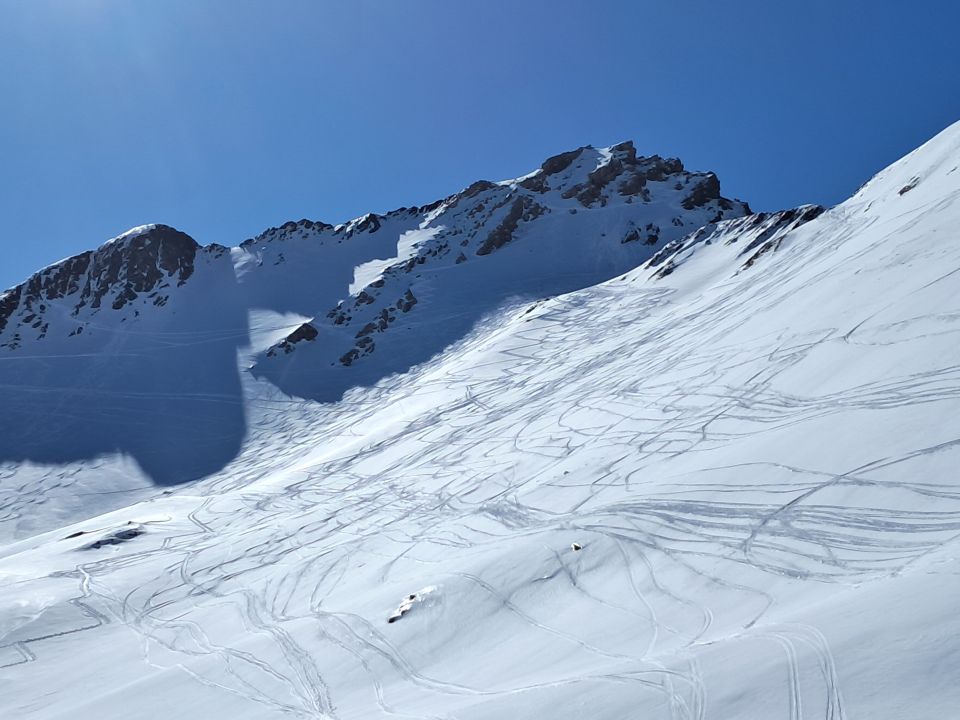 Auf der Piste ( noch Betrieb) bis Trittalpe. Also Schnee ab Parkplatz. Zur Stuttgarter Hütte apere Tragepassage durch steilen Hang. Oben viele Spuren, aber noch recht gut. Abfahrt 11.30 war eher noch zu früh.