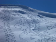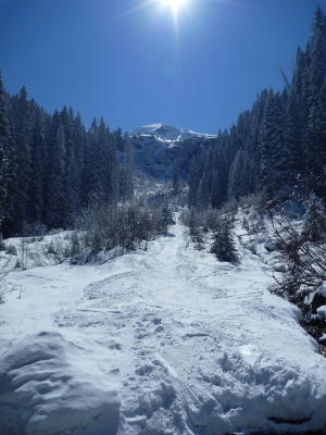 Abfahrt Vormittags bis auf 1700m (Waldeinfahrt unterhalb Grimmi) durchgehend in weichem, teils knietiefem Pulver. Auf der Strasse dann einige steinige Stellen. Nordhangeinfahrt (Grimmifurggi) auf ca. 2100m. Wäre man beim Waldende (Würzi) wieder auf die Ostseite des Senggibachs gewechselt, so hätte man fast bis zum Parkplatz fahren können.