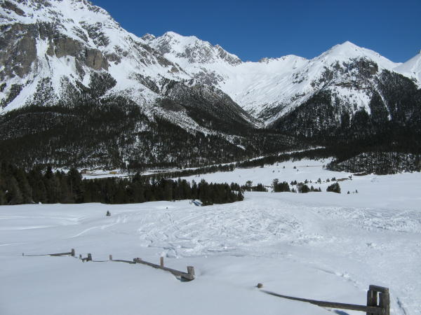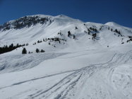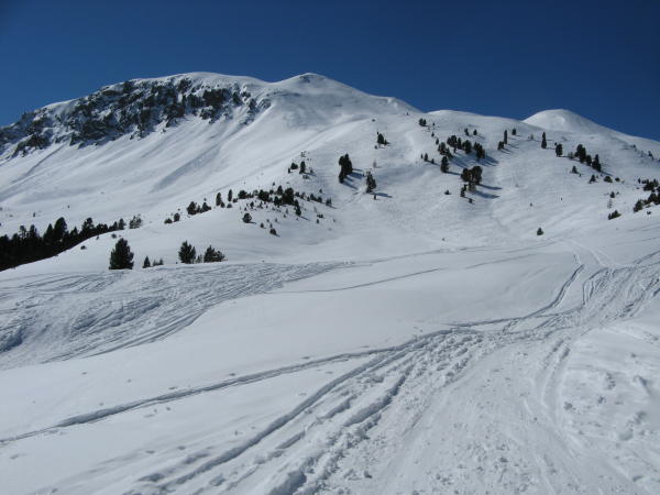 Unten etwas Bruchharsch neben der "Piste"... Dazwischen noch Pulverschnee, vor allem in windgeschützten Nordhängen. Oben durch den Wind abgeblasen und auch Pistenähnlich zu fahren. Generell gute Verhältnisse.