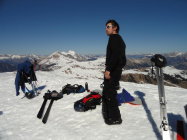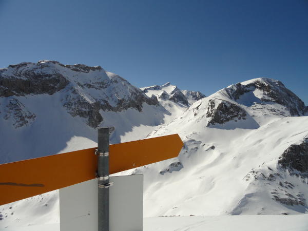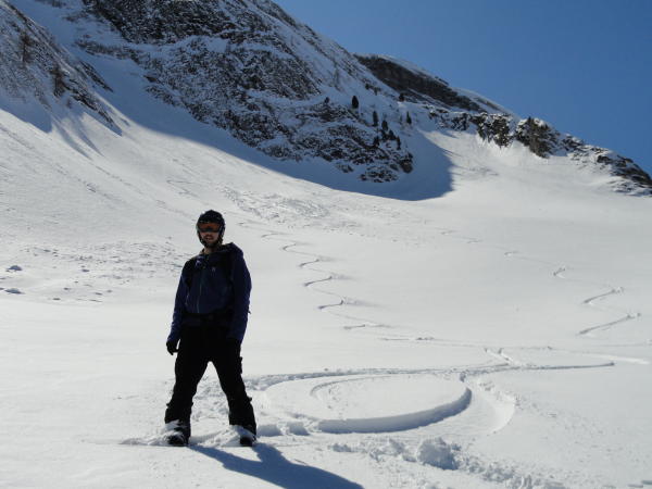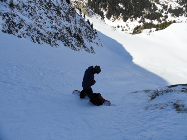 Abfahrt bis 2200 auf dem Hohberg, dann scharf nach links (nord) abbiegend in das hinterste Couloir eingefahren. 150 hm 42° steil direkt in die hintersten Hänge der Alp Pöris. Im Couloir auf der Gleitbahn eines alten Rutsches tragend und gut griffig. Unten im Schattenhang super Pulver in der Sonne Sulz vom feinsten.
