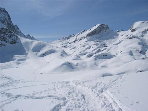 Schlussaufstieg von kurz unterhalb der Fuorcola noch ziemlich unbefahren = traumhafter Hang mit viel Platz für den eigenen "Zopf", aber auch Reduktionsfaktor "viel befahren" nicht vorhanden - wir waren am Dienstag nach den Neuschneefällen vom Sonntag die zweite Befahrung. Den kritischen Hangpartien kann man aber mit etwas Gespür (inkl. großer Abstände) relativ gut ausweichen.