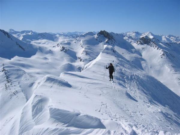 Wunderschöner Pulver v.a. in der Querung und in der Abfahrt bis zur Hochebene Camfer und Tgavretga. Dort dann erst mit dünnem, aber zunehmend unangenehmeren Deckel, der aufgrund des vielen Schiebens in der Spur und der anschließenden Abfahrt auf der Piste aber auch nicht mehr wirklich stört.