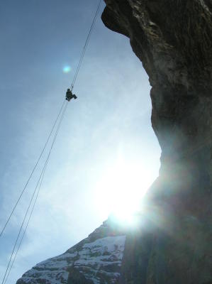 Die Route ist wohl immer trocken, da durchgehend überhängend. Der Zustieg ist mit Schneeschuhen gut machbar. Teilweise sogar aper. Vorsicht vor Nassschneelawinen bei Pt. 1475.
