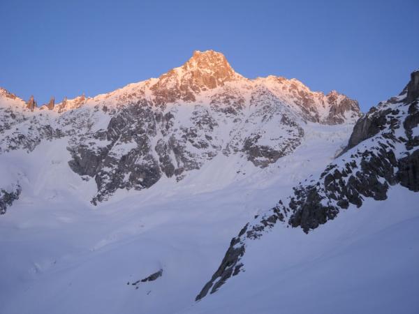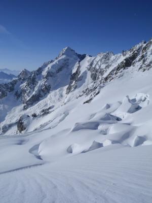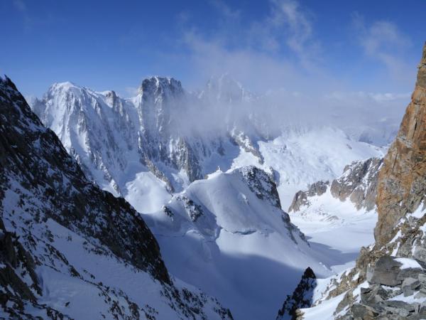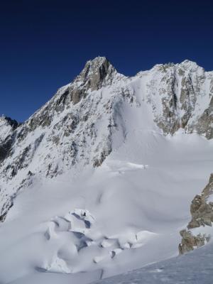 Wegen Nebel und Quellwolken N-Grat zum Tour Noir (WS+, bei locker verschneiten Felsen heikel) nach 1. Drittel abgebrochen und auf das E-Couloir (Abfahrtsspur) verzichtet.