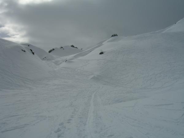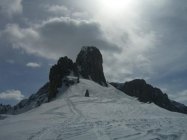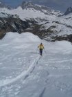 Leichter Zustieg über eingelaufenen Spuren. Gipfelzustieg einige eisige Stellen, aber ohne Eisen gut machbar. Fahrbarer aber sehr schwerer und kraftraubender Schnee in der Abfahrt.