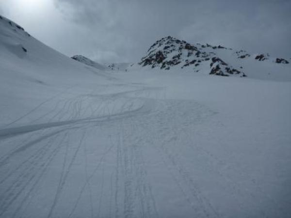 Gut fahrbarer Schnee auf einer Total durchnässten Altschneedecke welche unter einem etwa 10cm dicken gefrorenen Deckel verborgen liegt und darauf befindet sich der Pulver des letzten Schneefalls.