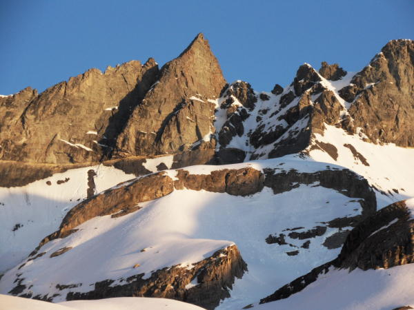 Mit dem Bike ab Langwis bis Wassertobel 1500 müM beinahe alles Schneefrei. Nun auf teis Sumpfigem Nassschnee bis Grossalp. Weiter auf meist tragendem Schnee bis Skidepo und auf guter Spur zum Gipfel. Die Kletterstelle war Schneefrei.