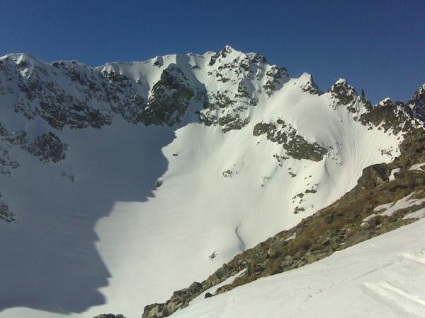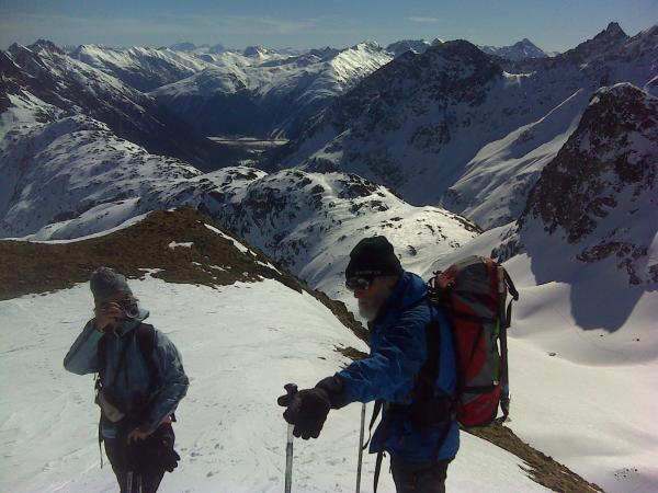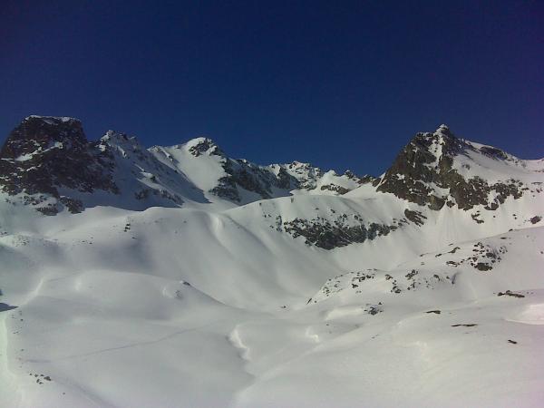 Bis 2750 m perfekte Verhältnisse, Gipfelhang voll Pulverschnee, z.T. Triebschnee, sehr gefährlich, heute nicht machbar.