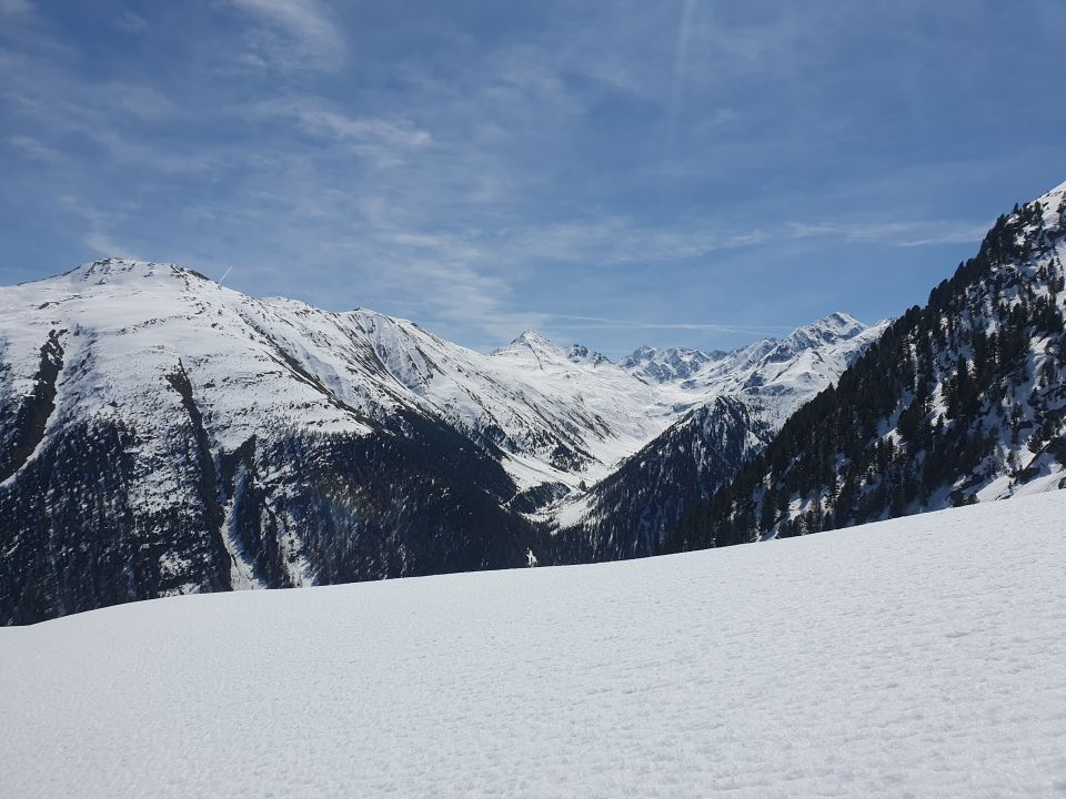 Da dieser Hang stark sonnenexponiert ist, ist es kaum vorstellbar, dass man ab da auf einer geschlossenen Schneedecke hochkommt. Empfehlenswerter ist es sicher diese Tour früher im Jahr zu starten.
