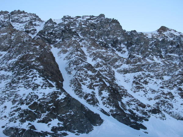 Couloir Septrional (400m links von Hannibal): anfangs eingebrochen, im steileren oberen Teil besser.Steigeisen, aber kein Pickel nötig gewesen (kein Blankeis). Sicher fahrbar, aber Plaisir auf Valsorey-Seite heute eindeutig besser! (schätze, dass obersten 200hm im Couloir nett gewesen wären, anschliessend aber lästiger Bruchharst... und keine Sonne! ;-) ).abfahrt über Valsoreyseite weiterhin gut eingeschneit bis ca. 2200m, dann 200hm Tragstrecke und wieder mit an- und abschnallen bis zur geteerten Strasse ob Bourg St.Pierre. Für Aufsteiger zur Velanhütte: auch beim Engniss 300m unterhalb der Hütte muss man schon kurz tragen. Unten raus wirds immer knapper - der Frühling ruft laut...