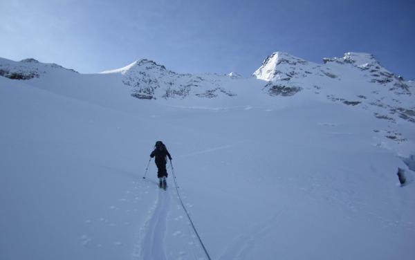 Gletscher gut eingeschneit, Gipfelfelsen eisfrei.