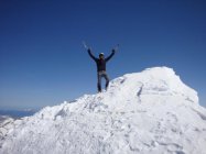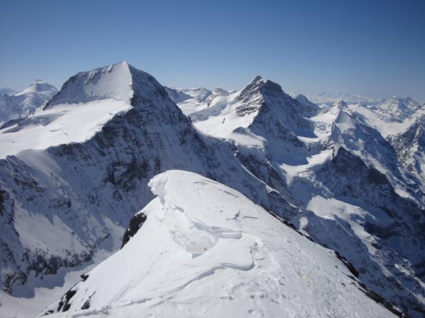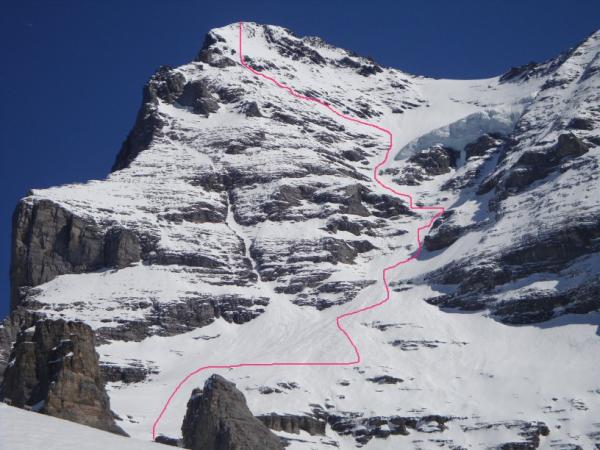 Von Grindelwald fahren wir mit der ersten Bahn hinauf via Kleine Scheidegg zur Station Eigergletscher. Hier können wir um 8:15 loslaufen. Das ist bereits etwas spät und es heisst nun halt schneller laufen. Der erste Dämpfer kommt dann gleich, der Schnee trägt nicht. Doch bereits 5 Minuten später laufen wir auf einem harten Deckel, also alles paletti. Wir kommen noch gut über die erste steile gebänderte Stufe hinauf, es hat hier aber schon jetzt recht wenig Schnee. Danach ziehen wir in etwas weniger steilem Gelände in Richtung Trichter unter den Eisbruch hinauf. Der ist ganz schön eindrücklich und man kann einfach nur hoffen, dass da nix herunter kommt. Auch wird es immer steiler und ab etwa ab etwa 2900m ist dann fertig mit lustig. Skier auf den Rucksack binden und zu Fuss weiter aufsteigen. Teilweise brechen wir knietief ein und dann trägt es wieder, oder man spurt Schuh tief. Sehr unregelmässig und recht anstrengend zum Spuren. Wir wechseln uns ab und jeder ist froh wenn er hinter her "wackeln" kann. Auf 3200m sind wir endlich aus der Schussbahn des Hängegletschers. Da ist einem gleich viel wohler bei der Sache. Dafür wird die Spurerei auch nicht ringer. Wir entscheiden uns dann um den Gipfel einfacher erreichen zu können auf etwa 3500m ein Ski- und Rucksackdepot zu errichten. Es geht nun einiges besser die restlichen sehr steilen 500Hm zum Gipfel hinauf zum spuren. Wir erreichen diesen bei fantastischem Wetter und Windstille um 12:30. Ein paar Fotos werden geknipst, aber für eine lange Pause ist leider keine Zeit. Die fortgeschrittene Tageszeit mahnt zum Aufbruch.