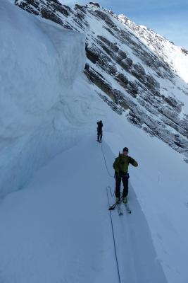 Der Schnee vom Coloir bis zum markanten Gletscherspalt auf ca. 3300m ist immer noch pulvrig. Vor allem ist letzen Steilhang (> 35 Grad) vor der Spalte ist eine defensive Routenwahl angebracht. Die Spalte (Schlüsselstelle) wird zur Zeit am besten folgendermassen überwunden: Hochsteigen zum rechten Ende der Spalte, dann horziontal direkt unter der Spalte queren, am linken Ende der Spalte zu Fuss (ohne Steigeisen) ca. 2m nach rechts haltend auf die Spalte hochklettern.