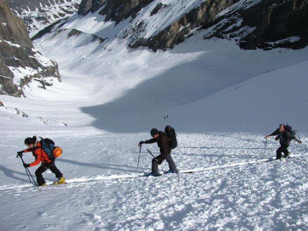 Tragend im Aufstieg. Wenig Schnee (Steinkontakt) auf Zackengrat. Gipfelflanke z.Z. ohne Harscheisen. Abfahrt bei richtger Zeitwahl hart uaf obersten 400hm, dann Sulz bis 2500m und weiter unten Nassschnee.