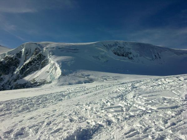 Viele Spuren, teilweise Piste, den Glacier de Piece hinunter nach Arolla.