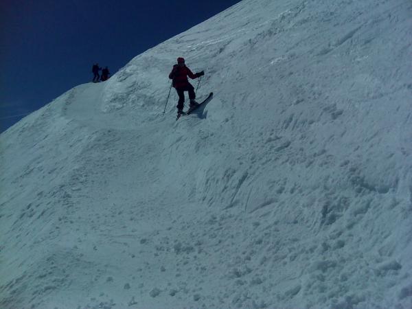 Harter und griffiger Schnee auf dem Aufstieg. Mässig gute Spur bei der Steilstufe, wurde durch uns verbessert. Problemsloser Aufstieg zu Gipfel.