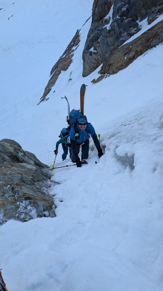 Abfahrt (machbar): Oben sehr hart und durch gefrorene Zastrugis und ale Spuren ruppig, mühsam zu fahren. Mittelteil streckenweise gut auf Hartschnee, dann auf etwa 2.500m Übergang zu Nassschnee. Abfahrt durch die Steilstufe zur Zeit viel anspruchsvoller als in den letzten Jahren, 40°+ Buckelpiste (nach meinem Empfinden definitiv S), wo teilweise das Eis herausschaut. Verständlich, warum manche hier auch mit Steigeisen wieder herunterstapfen.