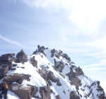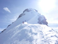 Der Westgrat hat gute Verhältnisse, der rege Heli-Betrieb trübt das Bergvergnügen allerdings.